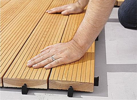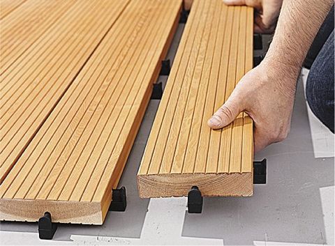 La unión FoX permite unir las maderas de forma fácil y sencilla para formar superficies de suelo. De forma manual se introduce el elemento de caucho en la ranura previamente fresada en la arista posterior del friso. Pieza a pieza hasta cubrir la superficie. Los diseños que se pueden adoptar, son muy variados: De forma de tablero de ajedrez, diagonal, longitudinal o transversal. Sin separación o con una ranura de separación para el desalojo de aguas fluviales. La distancia del friso hasta el suelo, está prederterminada en el elemento FoX.